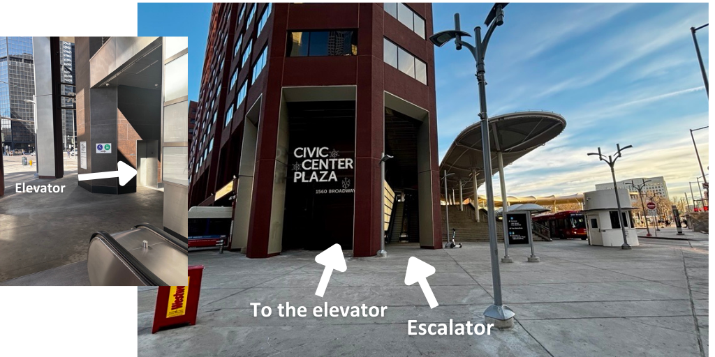 The only public entrance to the Civic Center Plaza building is on the southwest side, facing the bus stops. You can get to the entrance by going up the outdoor stairs, escalator, or elevator on the northeast corner of Broadway and 16th Street, where the bus stops are located. After going upstairs and inside the building, go to the elevators that lead to floors 2-11 and take one to the 11th floor, where you will find our reception area.